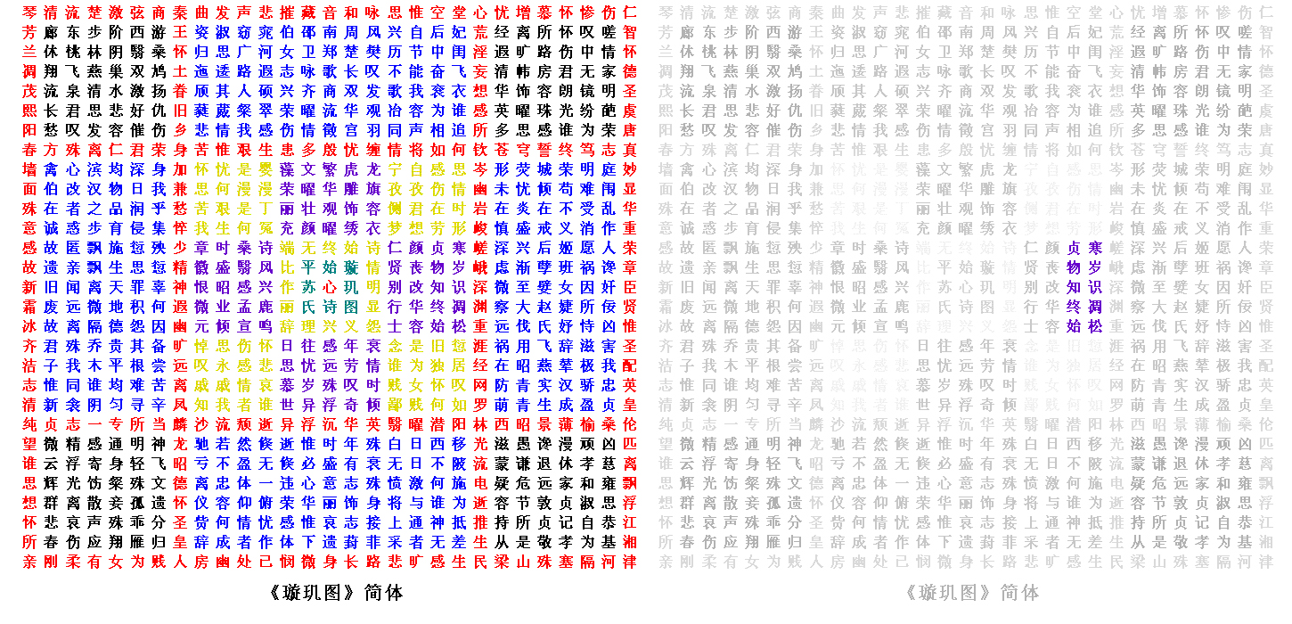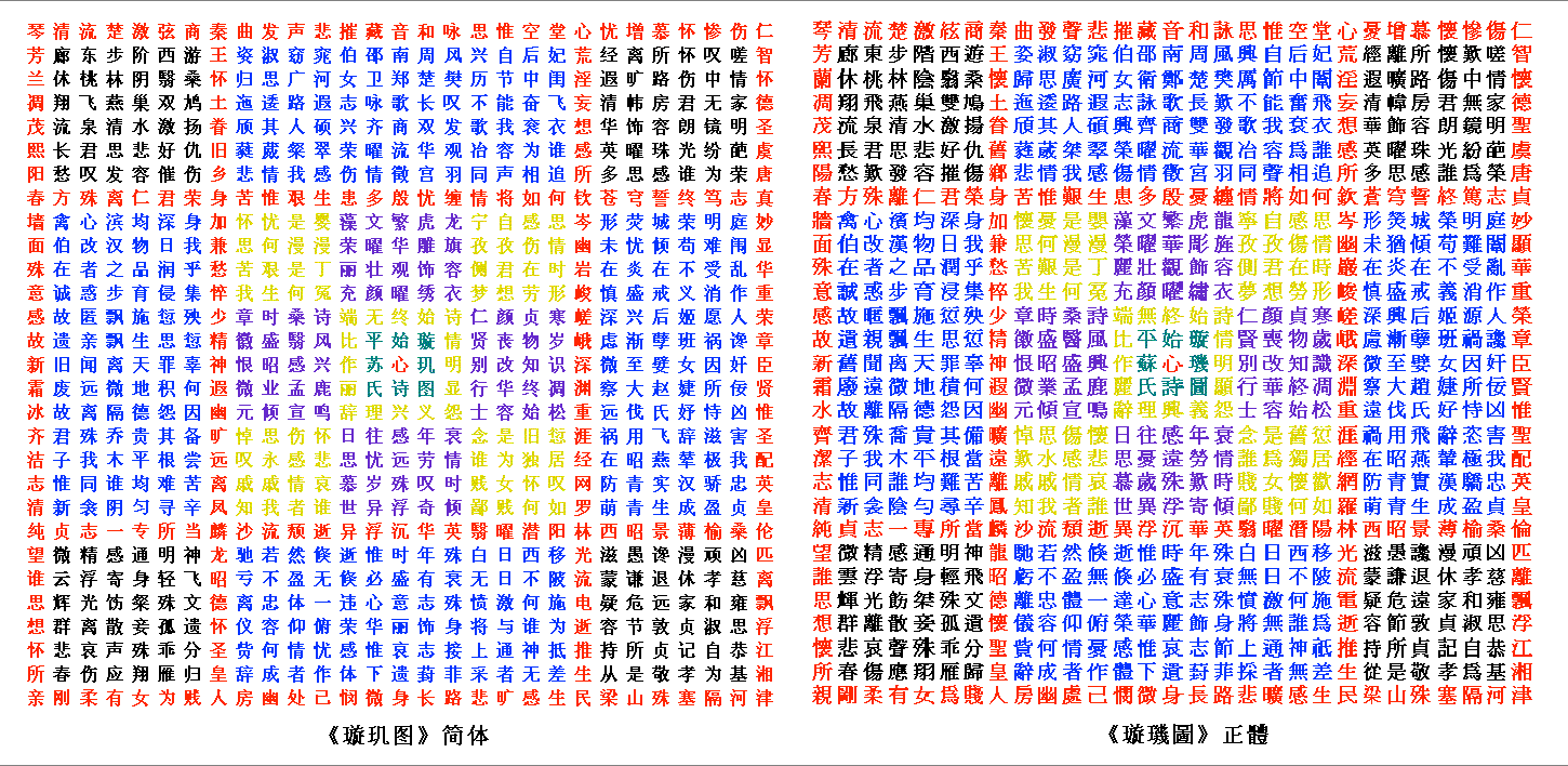 — But the very first such poem is the most amazing of all. The form was invented by a fourth-centurty poet named Sū Huì (also called in the book Su Shi, for reasons which are not quite clear to me, although confusingly enough there is a different Chinese poet from seven centuries later of that name). The later poems were “mere essays in the craft”, but Sū Huì created a flat-out masterpiece, which contains (depending on who’s counting) at least 200 and possibly as many as 12,820 different poems, when read in different (quite reasonable) orders. (It is worth recalling, in this context, that classical Chinese did not have a standard reading order, and could be written and read left to right, right to left, top to bottom, or bottom to top, so that all these orders were, in that context, perfectly natural.) Here’s a picture of the poems, with subsections highlighted in different colors. Note that this gives the entire poem twice, once on each side: the left side is in the simplified characters currently in use in mainland China, and the right side is in the traditional characters that Sū Huì would have written.